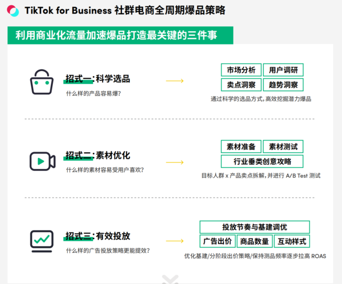 选品、素材优化和有效投放这三方面的兼顾,其实也是品牌商家所关注的核心问题“如何从0到1打造爆品”的答案。