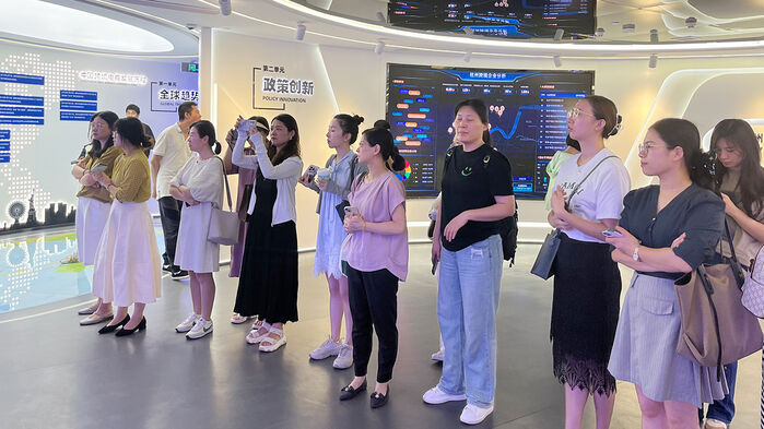 讲解员向培训班学员深入介绍了杭州综试区成立八年以来,在模式、政策创新等方面的工作经验,展示了杭州跨境电商生态体系、人才培养、品牌建设等方面的发展成果。