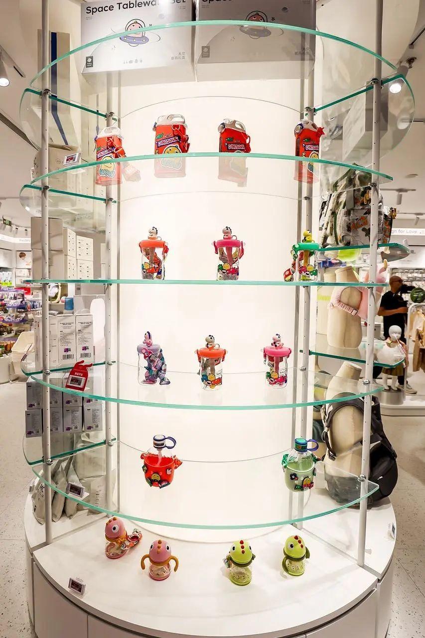 分布在店中的岛台主要展示辅食、电器以及大型用品比如学步背带、学食餐椅等。墙面货架依次摆放着玩具、纸尿裤、洗漱用品、餐具、湿巾纸巾、婴儿服饰等。而柱型展示架则拣选了Babycare的各类王牌产品,比如让品牌起家的儿童背带、爆品紫盖湿巾、纸尿裤、水杯等。