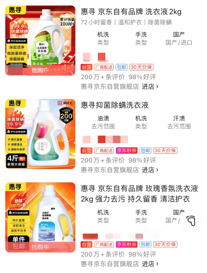 截至目前,惠寻的多款明星洗衣液均收获了超过200万条的真实好评,在京东同类产品的排行榜中,多次霸榜销冠。