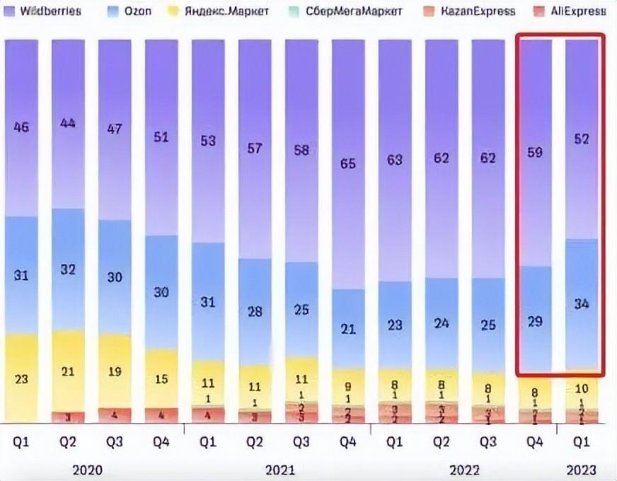 2023年Q1 俄罗斯各电商平台卖家活跃情况: