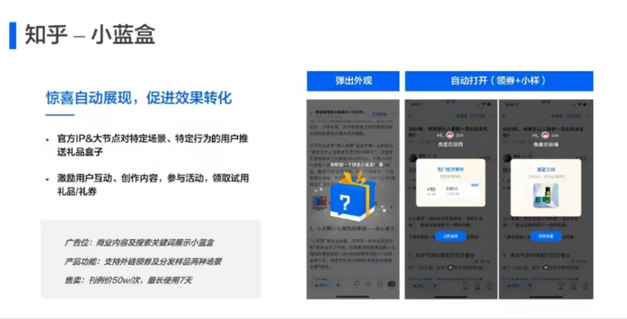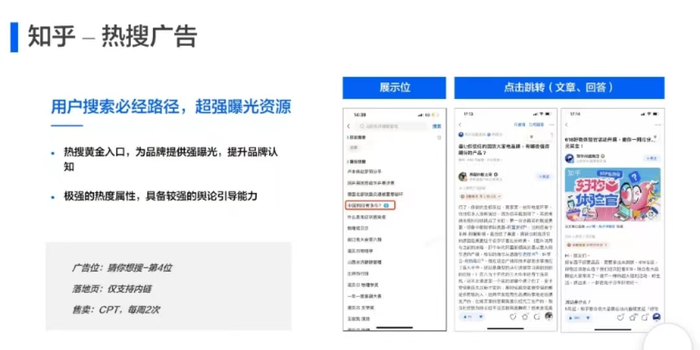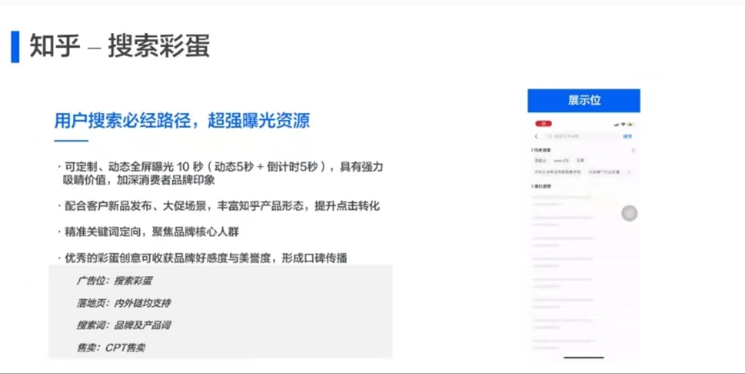 根据搜索营销通案,在内容搜索以及品牌广告方面,知乎将提供搜索竞价、热搜词、搜索彩蛋以及知乎小蓝盒等多种产品形态,满足品牌的个性化营销诉求。据了解,搜索“智能投放”、搜索“抢排位”等功能都是平台今年新推出的效果营销产品。