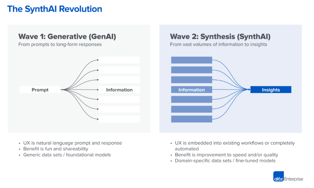 决策式AI(SynthAI):给内部用,省自己时间。主要集中在信息的汇聚,即通过综合和分析现有的大量信息,以更简洁、更易于理解的方式呈现出来。这种类型的AI模型能够从大量的数据中提取和总结关键信息,帮助人们更快、更有效地做出决策。
