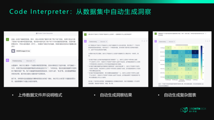 如果让AI来批量处理数据,那目前测试下来ChatGPT自带的Code Interpreter功能是最好用的。这是一个沙盒化的Python环境,允许用户在聊天界面中执行Python代码。用户可以通过自然语言指挥ChatGPT编程,以完成各种任务,如OCR转换PDF文件、视频剪辑、数学问题解答、数据分析和可视化等。你相当于有了一位私人专属的数据分析师+程序员。