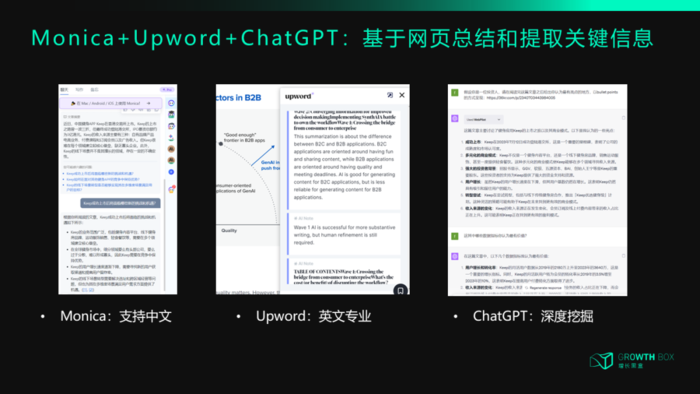 Monica:国内强大的产品团队做的出海产品,基于ChatGPT的全能AI助手,可以在所有网站和设备上使用,支持文字总结翻译、机器人对话、文本图像生成。这里我最常用它的chrome插件,可以一键总结当前网页的内容,并进行追问。虽然是面向海外市场,但中文支持优秀,日常文章可以用它。