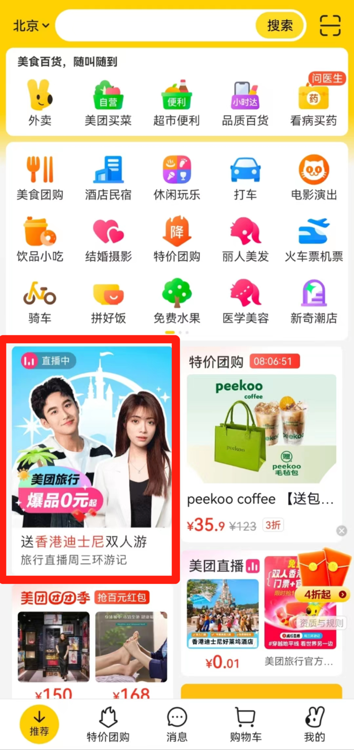 7月中旬,美团在App首页上线固定的直播入口。这意味着与抖音的角力再度升级,竞争正在从对B端商家的争夺,逐渐拓展到内容、流量和运营等领域。