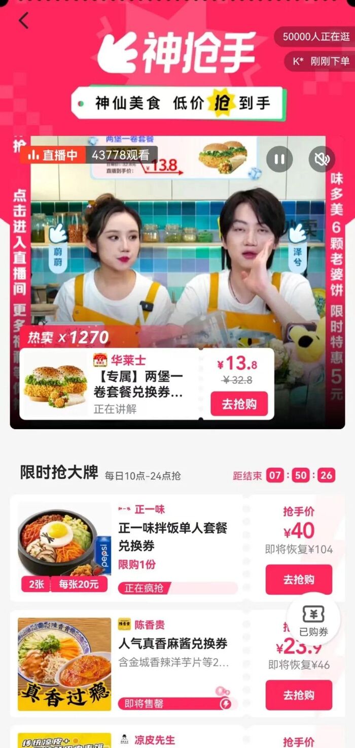 相反,餐饮等商家的折扣反而并不算高,直播间较店铺货架普遍便宜5%-10%。比如牛约堡外卖,店铺货架价格为39.9元,直播间自播价格则为37.9元。总体上来说,不管是平台还是商家,低价都是切入直播很好的支点。