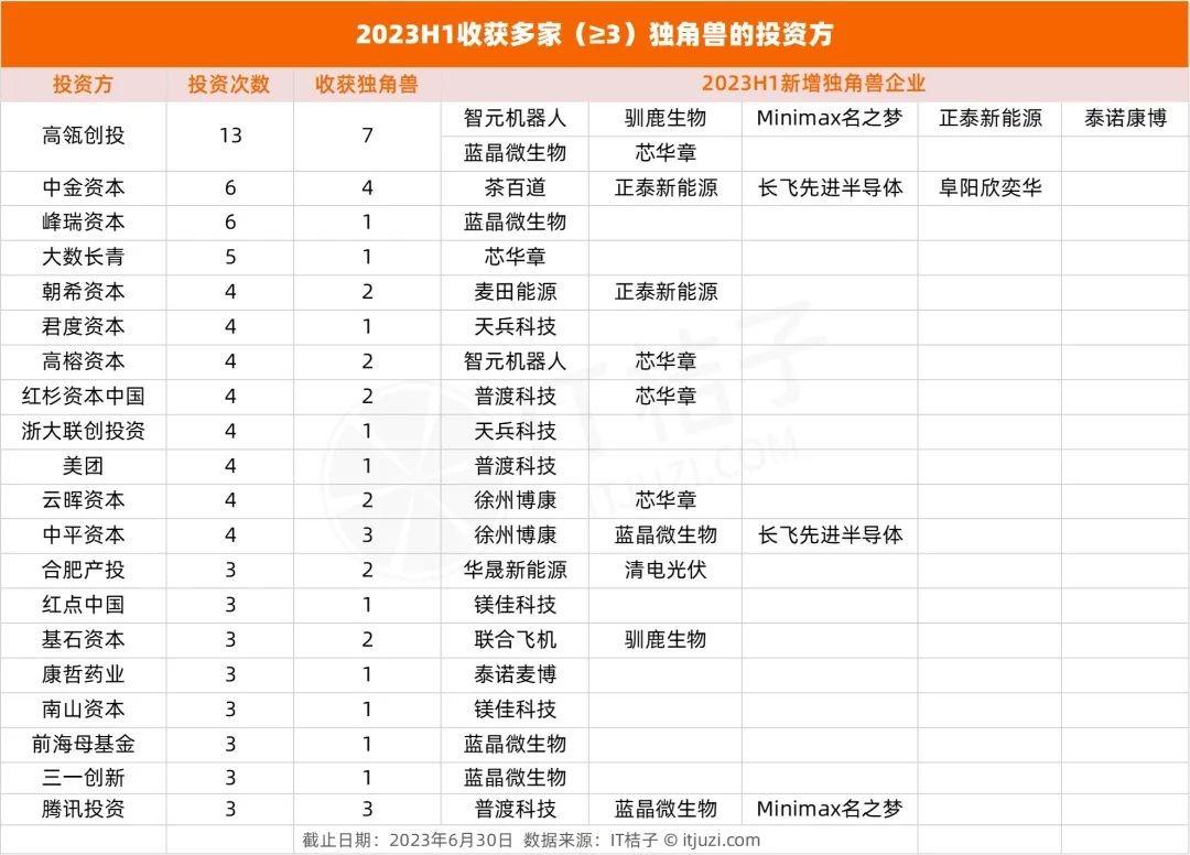 根据IT桔子「独角兽俱乐部」数据,2023年H1中国新晋独角兽企业涉及集成电路、新能源/新材料、生物技术和制药、机器人等多个领域。在这些企业成为独角兽的路上,高瓴创投、中金资本等明星资本为其保驾护航。