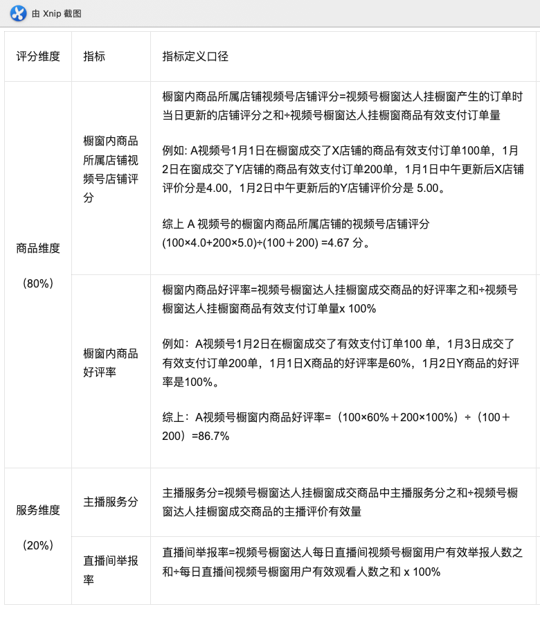 店铺评分为5分制,最低为3分,由服务体验、商品体验、物流体验三个视频号橱窗用户体验维度组成。各自权重为2:4:4。