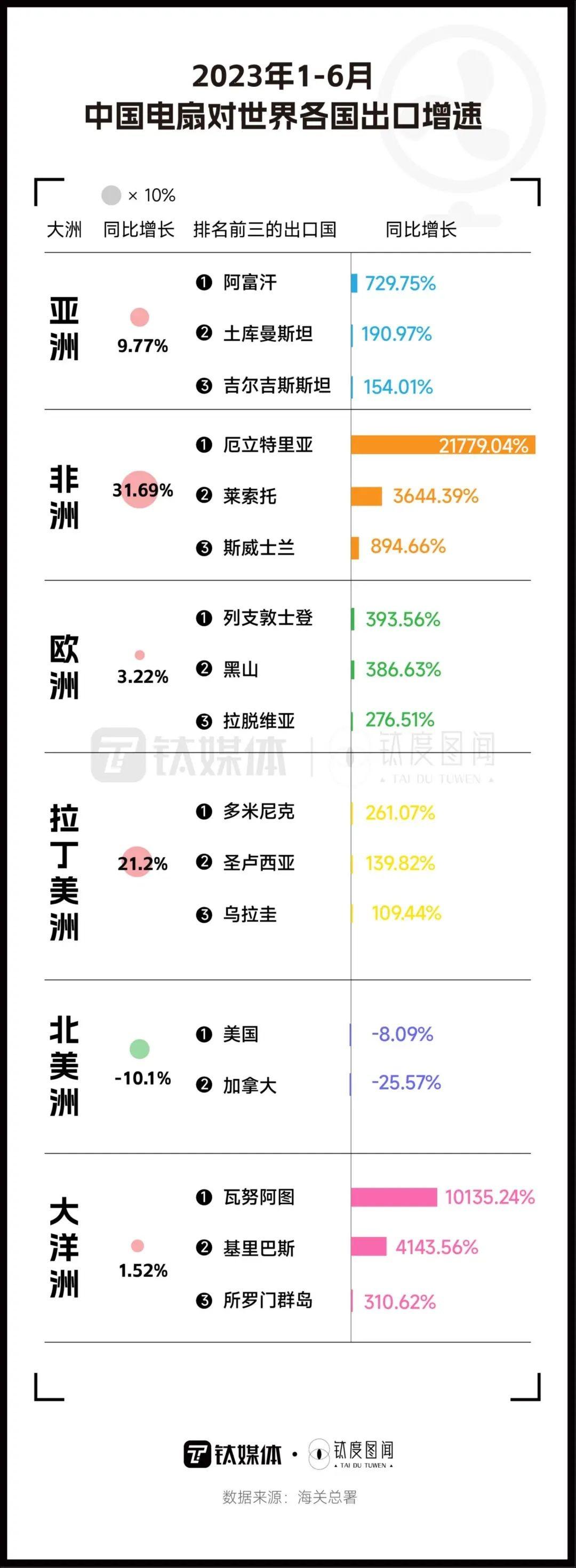 其中,中国电扇对亚洲的出口金额最高,非洲的出口同比增速最高,同比增长31.69%。其次,出口额增速排名第二的是拉丁美洲,增幅为21.2%。而亚洲、欧洲、大洋洲的同比增幅较小,均在10%以下。