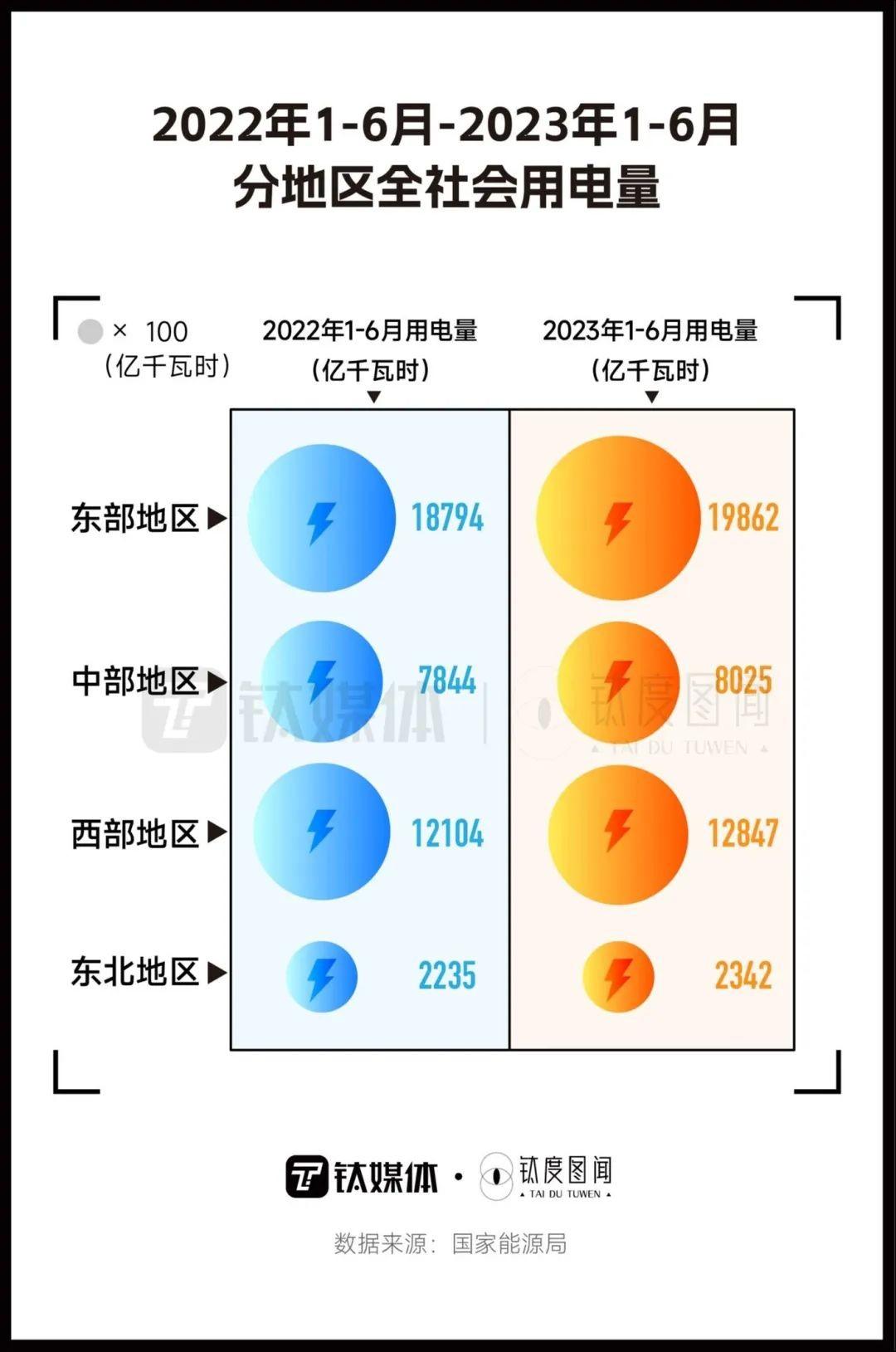 从地区来看,1-6月,东、中、西部和东北地区全社会用电量分别为19862、8025、12847和2342亿千瓦时,增速分别为5.7%、2.3%、5.7%和4.8%。