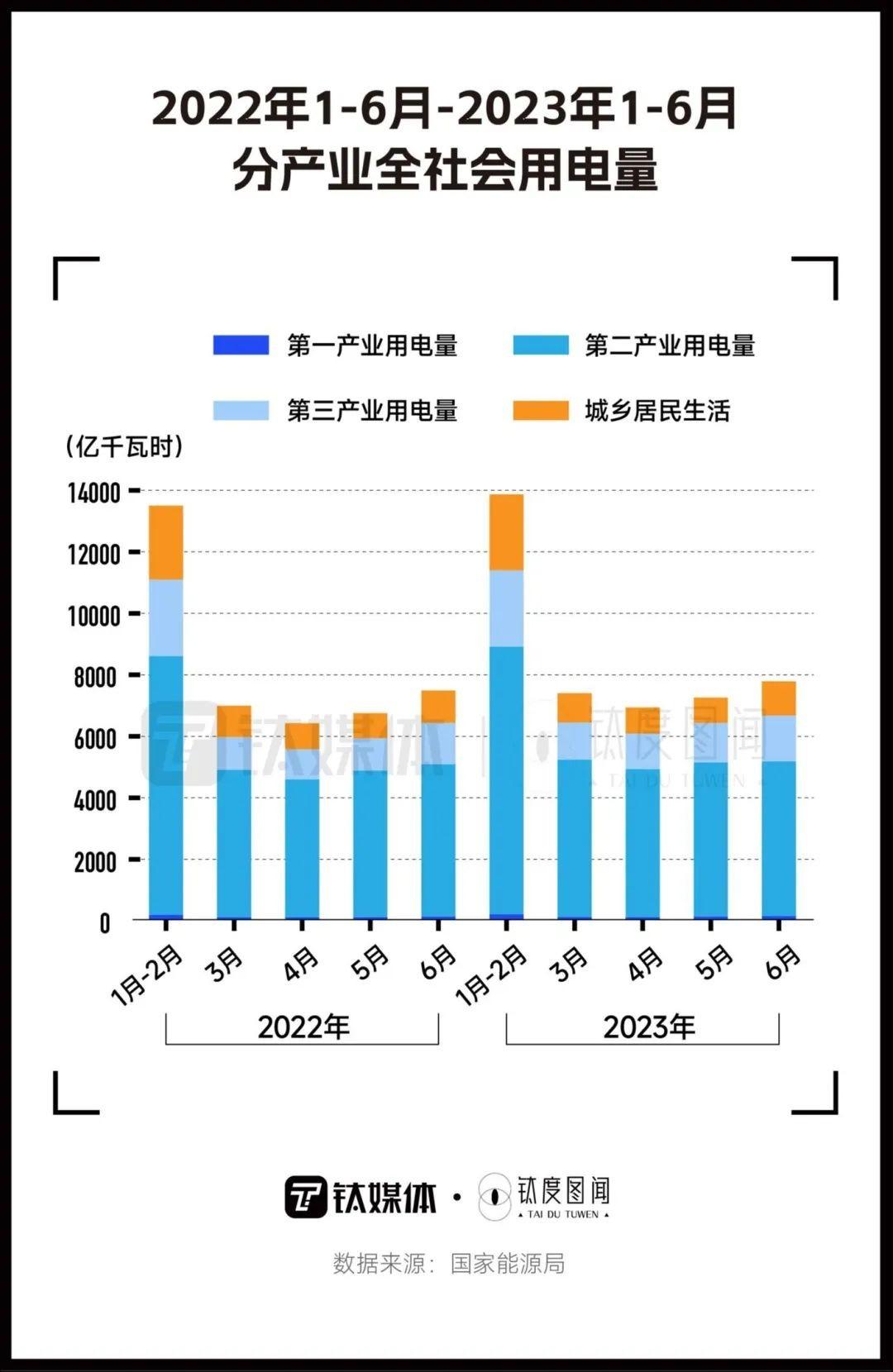 6月当月,各产业用电量达到最高,第一、二、三产业用电量增速分别为14.0%、2.3%和10.1%;城乡居民生活用电量同比增长2.2%。