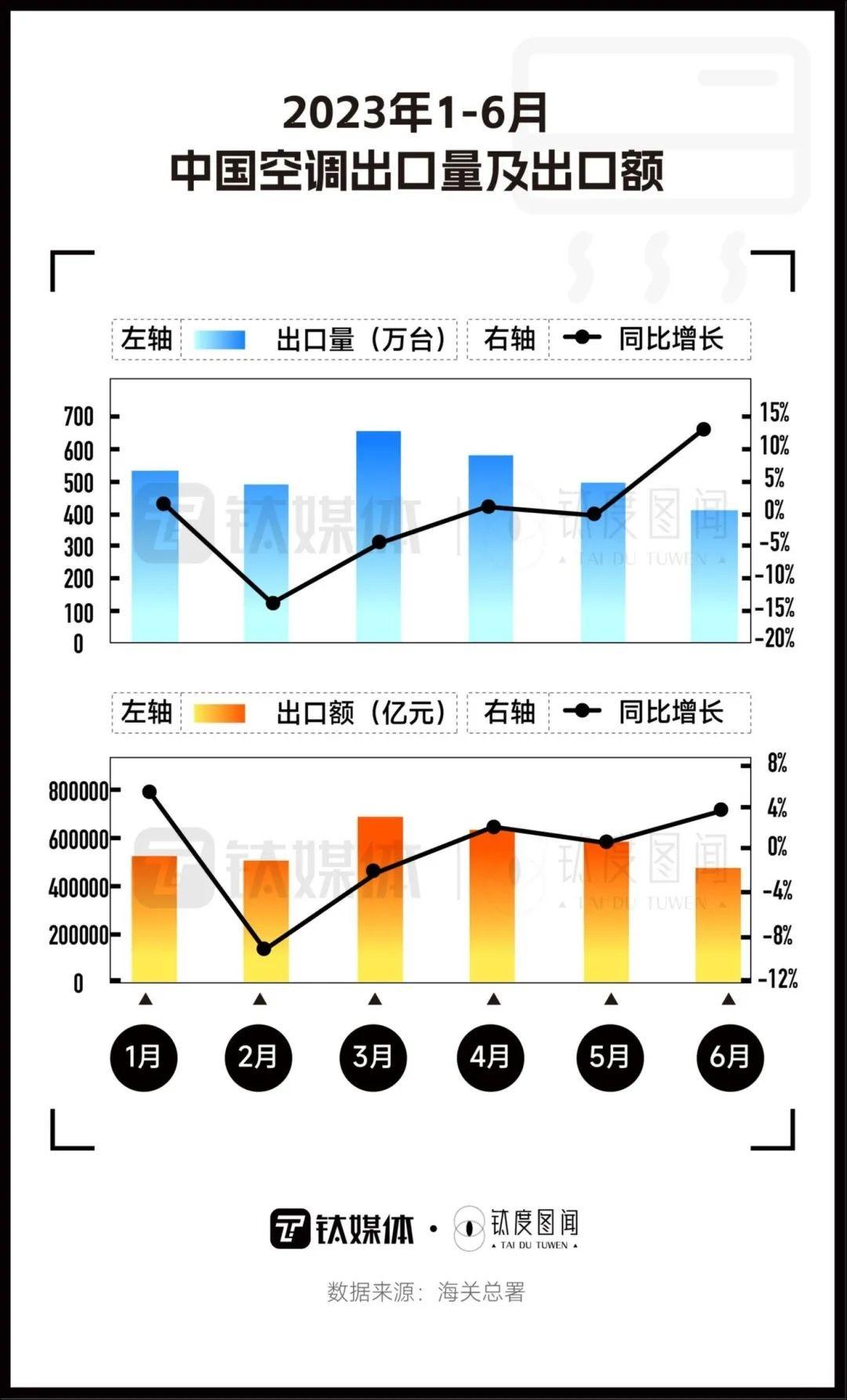 数据显示,今年上半年,中国空调共出口3167万台,其中,今年4月和6月,空调出口量分别同比增长1.2%和13.2%。在出口额方面,今年上半年空调出口额共计341.7亿元。从今年4月起,空调的出口额数据就持续向上,今年4月、5月、6月,中国空调出口额比去年同期分别增长了2.6%、1.1%和4.1%。