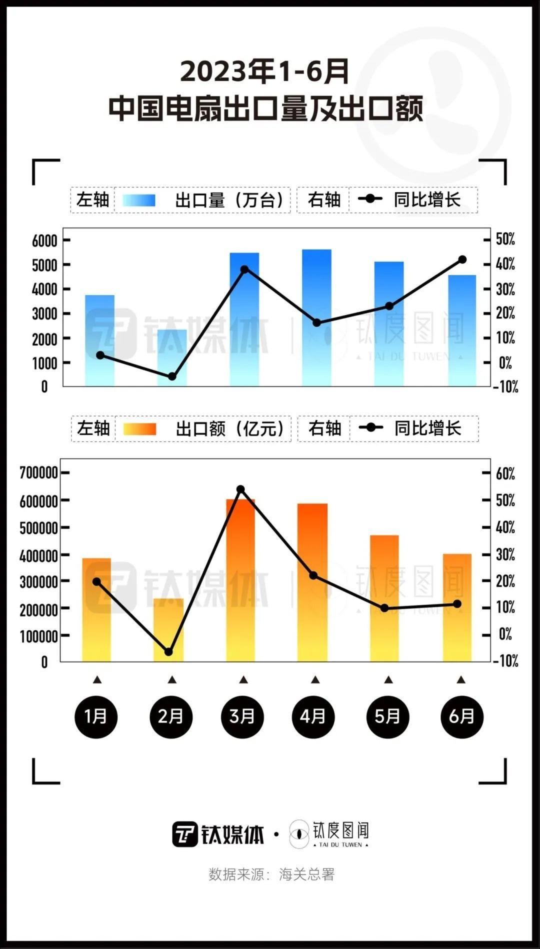 除了空调,电扇的海外需求也很大。2023年上半年,中国电扇出口量达26620万台,同比增长19.1%,出口金额达257.8亿元,同比增长15.9%。