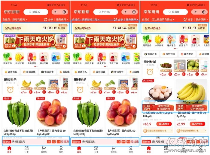 将自提点定位到合肥后,部分商品图片带有“开城盛典”字样的角标。和北京、廊坊等地相比,全场优惠活动也由满5元返5元,升级为了满5元返8元。