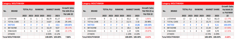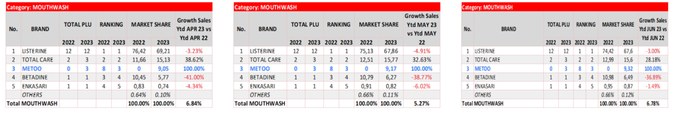 令当地人略感惊奇的是,2023年一季度以来,一款中国人做的漱口水开始在Indomaret和Alfamart攻城掠地。目前,这款名为Metoo的漱口水已达到该品类KA渠道(大型连锁商超渠道,如沃尔玛)的销量前三。而在上线至今的15个月的时间里,它早已在TikTok等电商端销量登顶。