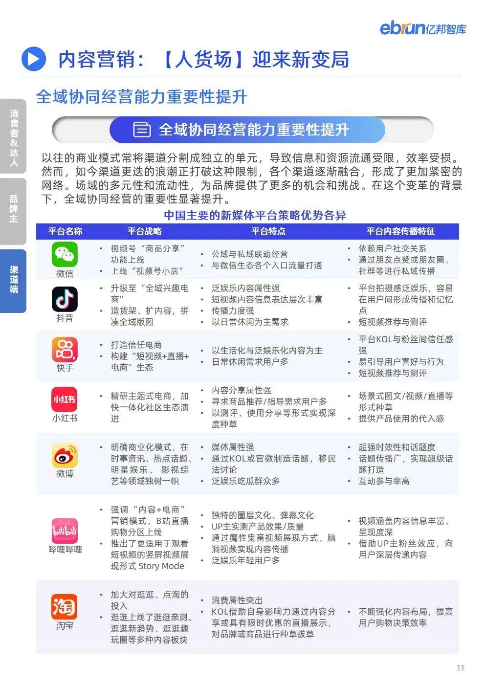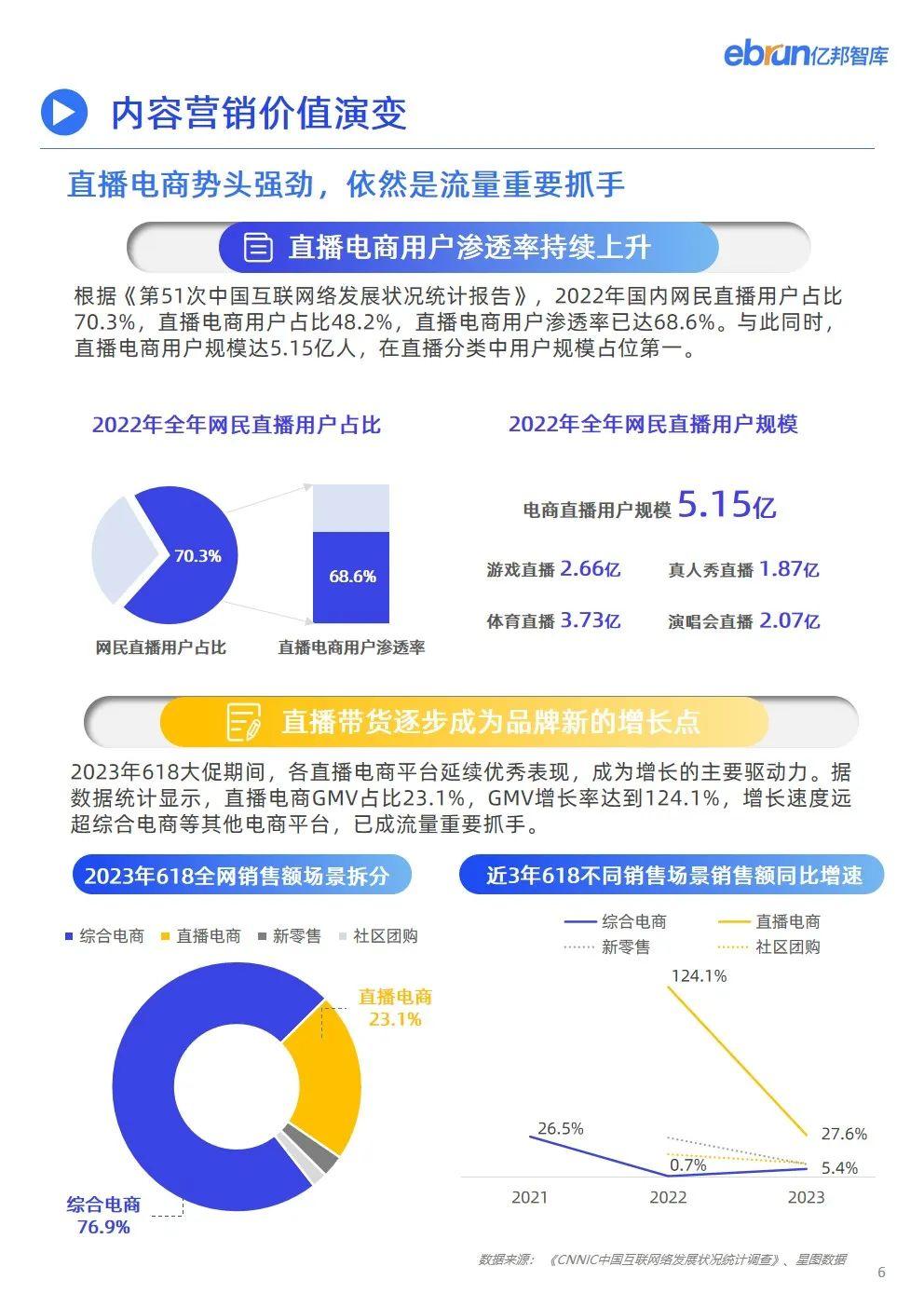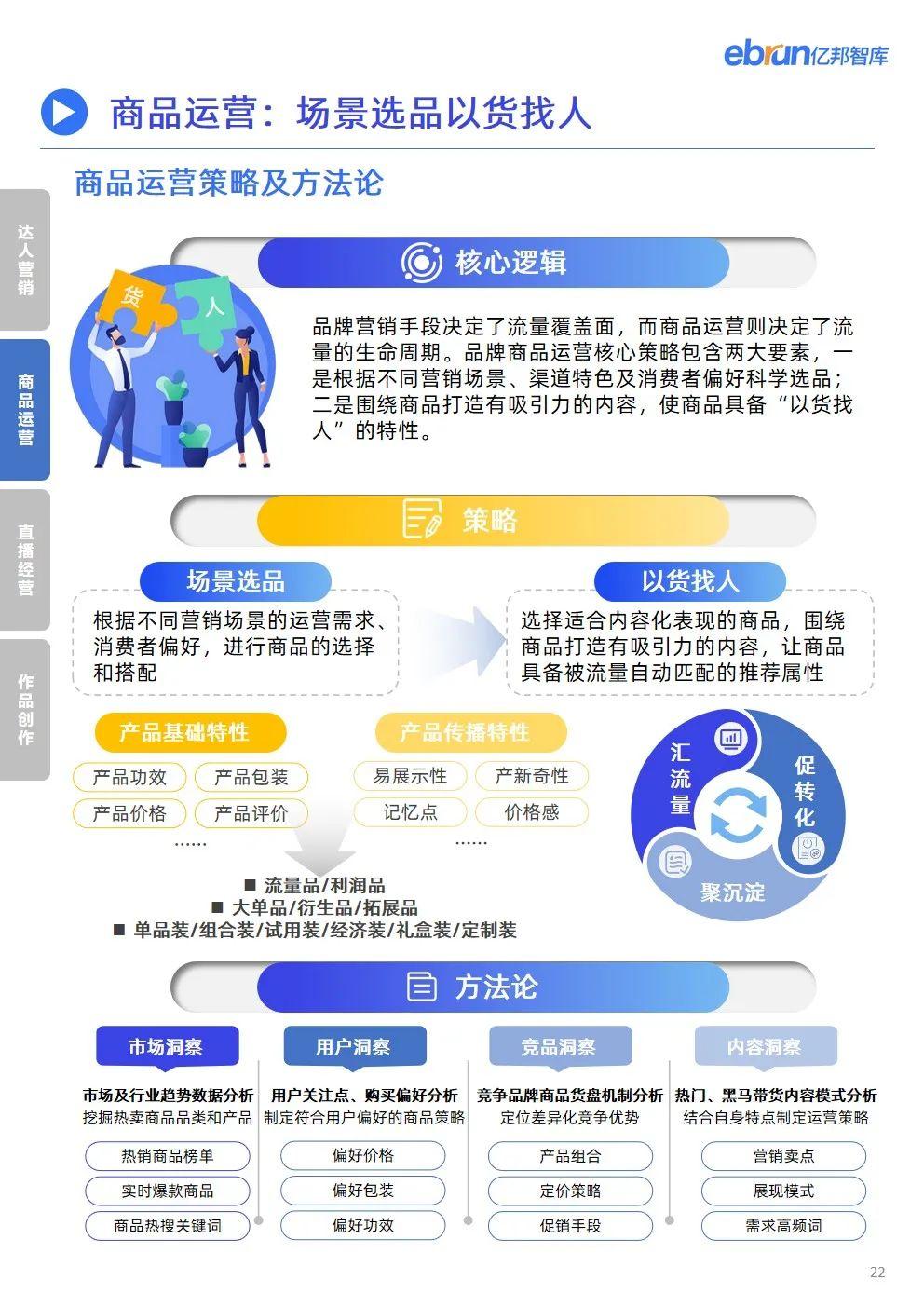 2022年,社媒用户数及社媒电商规模同步呈高景气增长态势,内容营销价值凸显。与此同时,平台间“人找货”和“货找人”的链路被双向打通,内容与电商之间正逐步打破藩篱,融合加深。直播电商用户渗透率持续上升,直播带货逐步成为品牌新的增长点。