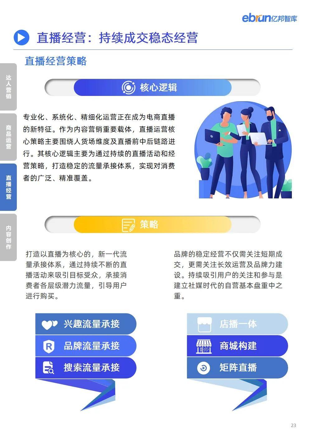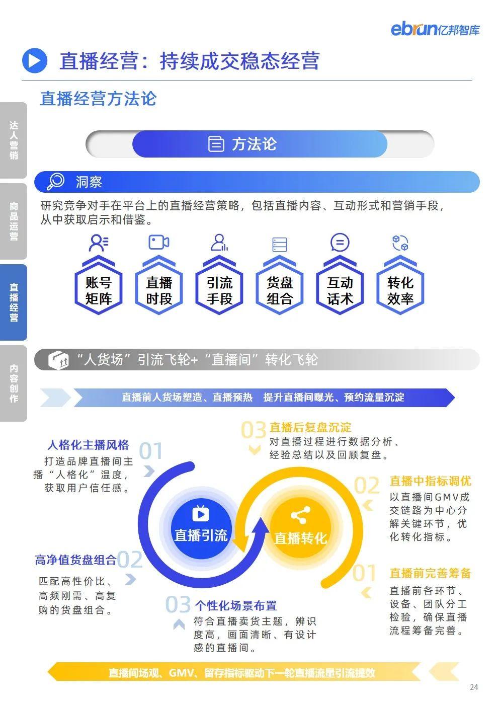 专业化、系统化、精细化运营正在成为电商直播的新特征。作为内容营销重要载体,直播运营核心策略主要围绕人货场维度及直播前中后链路进行。其核心逻辑主要为通过持续的直播活动和经营策略,打造稳定的流量承接体系,实现对消费者的广泛、精准覆盖。