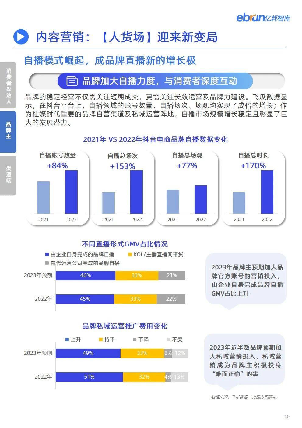 随着流量红利消退,获客成本提升,品牌更趋向以效果导向思维进行广告投放,关注营销带来的增长质量与转化效率。自播同时成为品牌打造稳定经营及品牌力建设主要阵地,其市场份额逐步提升且具备巨大增长空间。