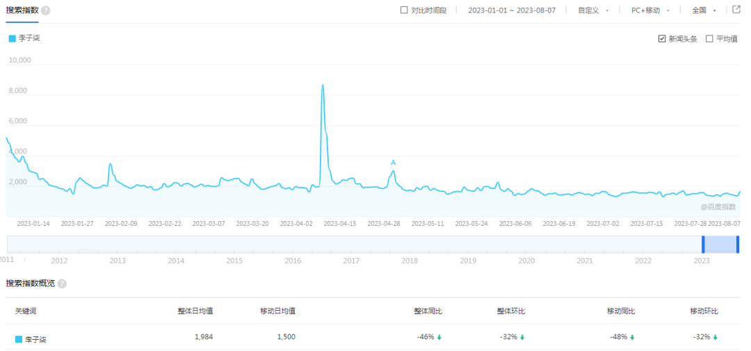 截至发稿前,李子柒抖音粉丝4919万,快手粉丝959万,B站粉丝761万,微博粉丝2602万,全网掉粉超过600万。此外,百度指数显示,2021年,李子柒的搜索指数日均值为7932,到了今年,这一数值仅为1984。