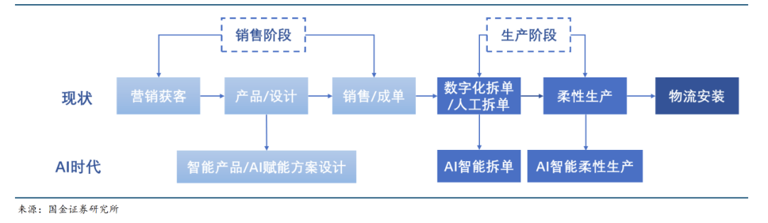 在“整家定制”的全品类融合销售趋势下,后端生产决定了交付效率、安装成功率以及能否实现“所见即所得”,除了设计端的AI应用,前后端系统打通以及后端生产流程智能化也是厂商们关注的重点。