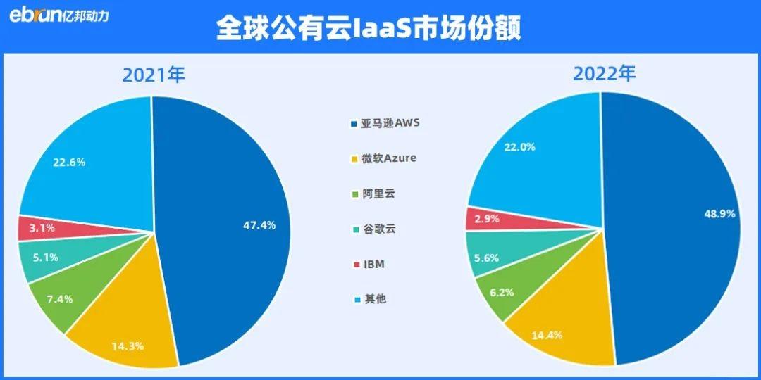 与2021年相比,阿里云市场份额在减少,而亚马逊和谷歌所占市场份额在增加。