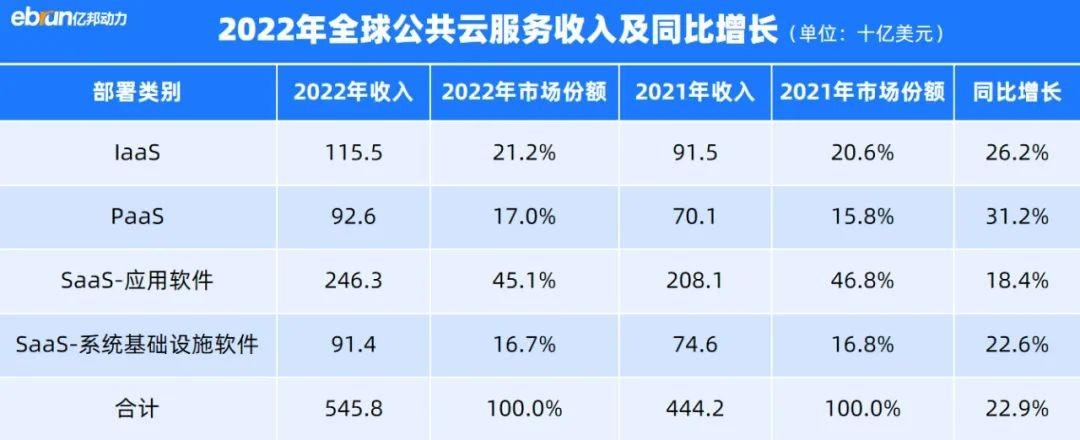 IDC在7月6日发布的《全球公共云服务半年度跟踪报告》显示:2022年全球公共云服务市场收入总计为5458亿美元,其中,SaaS(软件即服务)是公共云服务收入的最主要来源,占2022年总收入的45%以上。