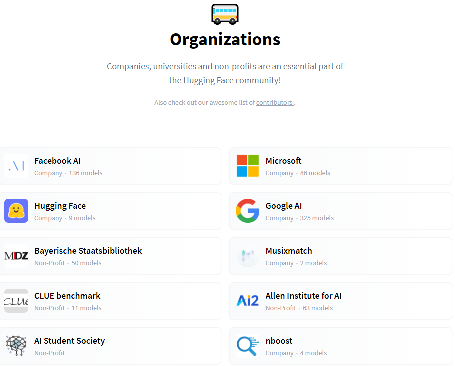 截至 2023 年 6 月1日,Hugging Face 共享了 215,693 个训练模型,38,085 个数据集,涵盖 NLP、语音、生物学、时间序列、计算机视觉、强化学习等几乎所有领域,搭建了全球范围最完整的 AI 开发者生态。而且,Facebook、微软、Google都是Hugging Face上活跃的模型贡献者。
