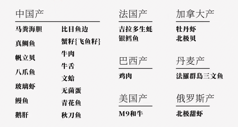 尽管很多人抱着“最后的晚餐”来吃日料,但实际上,从供应端来看,客单价在几百元的日料店少有来自日本直供的海鲜货源,各类海鲜的产地大多来自世界各地。