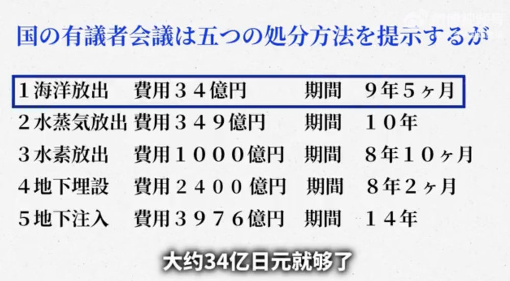 2016年6月,日本核能主管部门发布报告称,经过对海洋排放、地下掩埋(加入水泥等固化后埋入地下)、地层注入(用管道注入地层深处)、蒸汽释放(气化为水蒸汽排入大气)、氢气释放(电解为氢气排入大气)等5种方法的评估,“处理水”过滤稀释后排海是“成本最低”的方法。