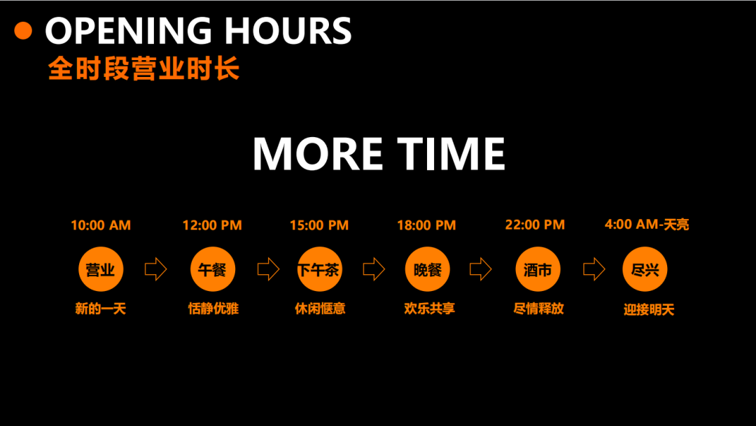 所谓全时段不是指24小时开店,而是丰富品类,早上提供早餐,中午提供午餐,下午提供下午茶,晚上还能提供酒精饮料,顾客什么时间来,都有消费的可能。