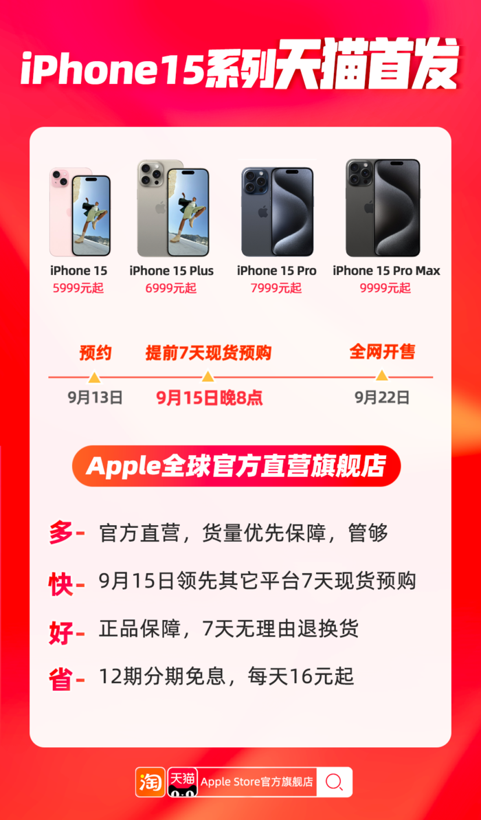 作为Apple的官方旗舰店,天猫Apple Store官方旗舰店第一时间上线iPhone 15系列新品预约通道,同时将在9月15日晚8点,领先其它电商平台7天,开启现货预购,保障消费者第一时间购买到新机。