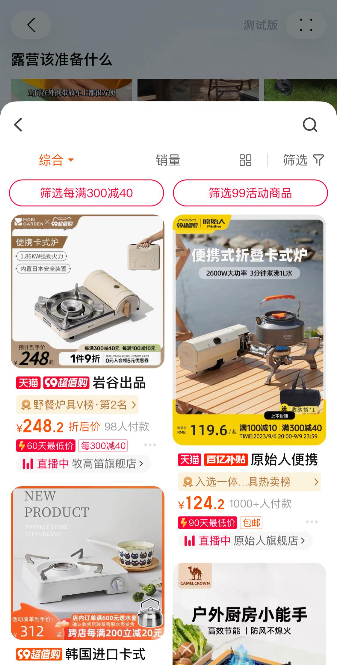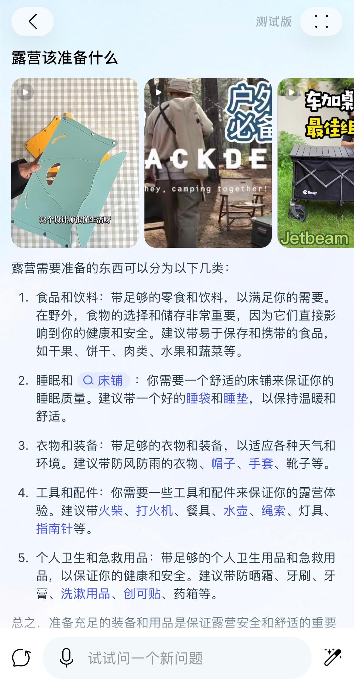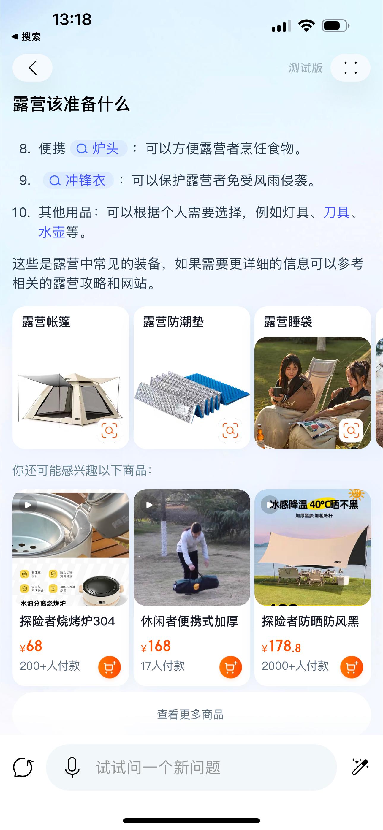 亿邦动力尝试提问“露营该准备什么”,AI输出的结果主要由三部分组成:淘宝逛逛视频、文字答案和话题相关产品推进。在文字内容中,也有话题相关商品的关键词,点击可以直接导向商品推荐页。