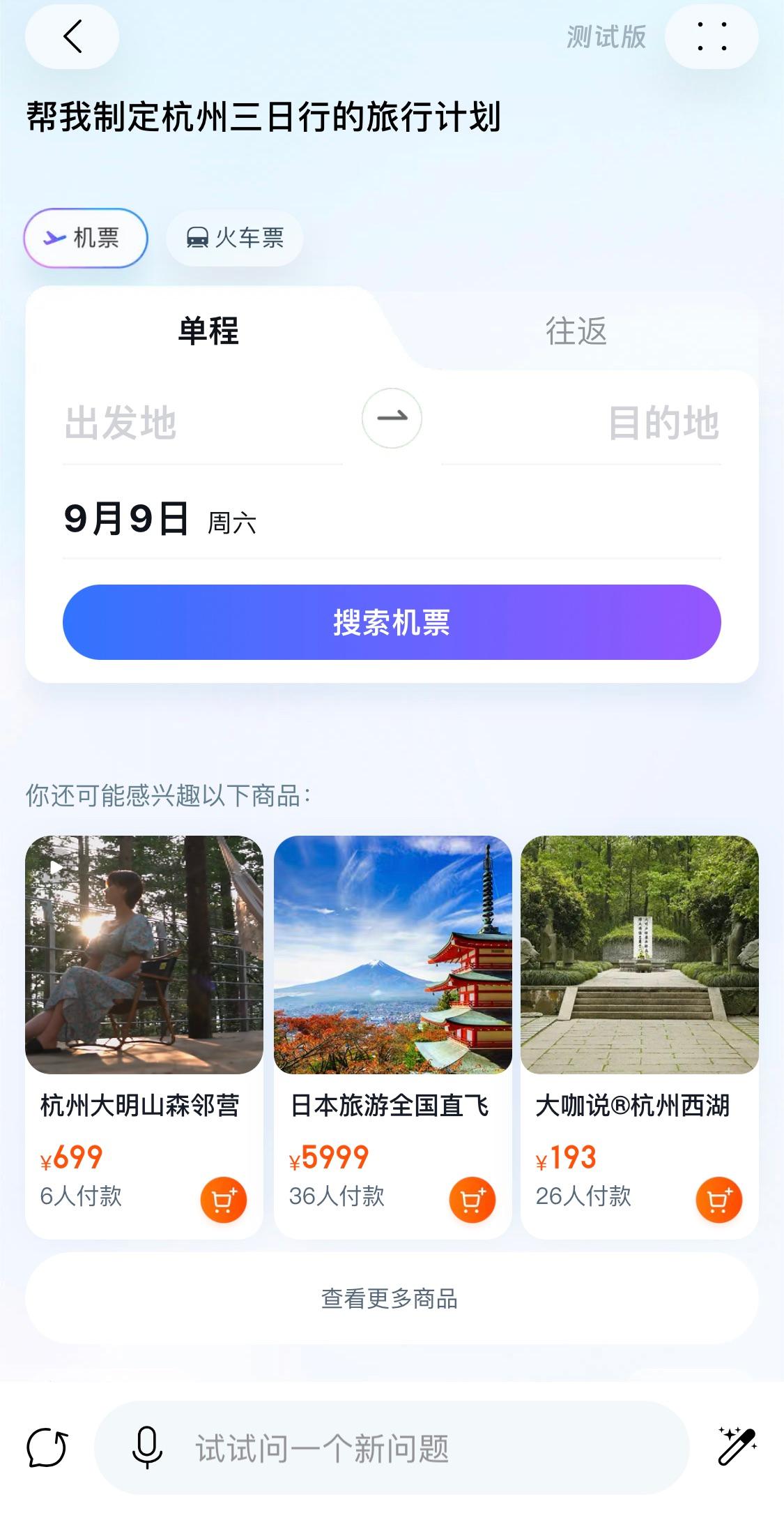 在“旅行策划人”的提问场景中,AI在推荐旅行线路时,也会融入了相关地点的酒店、机票、门票等行程预定服务,点击相关链接会跳转至飞猪中对应的商品详情页。