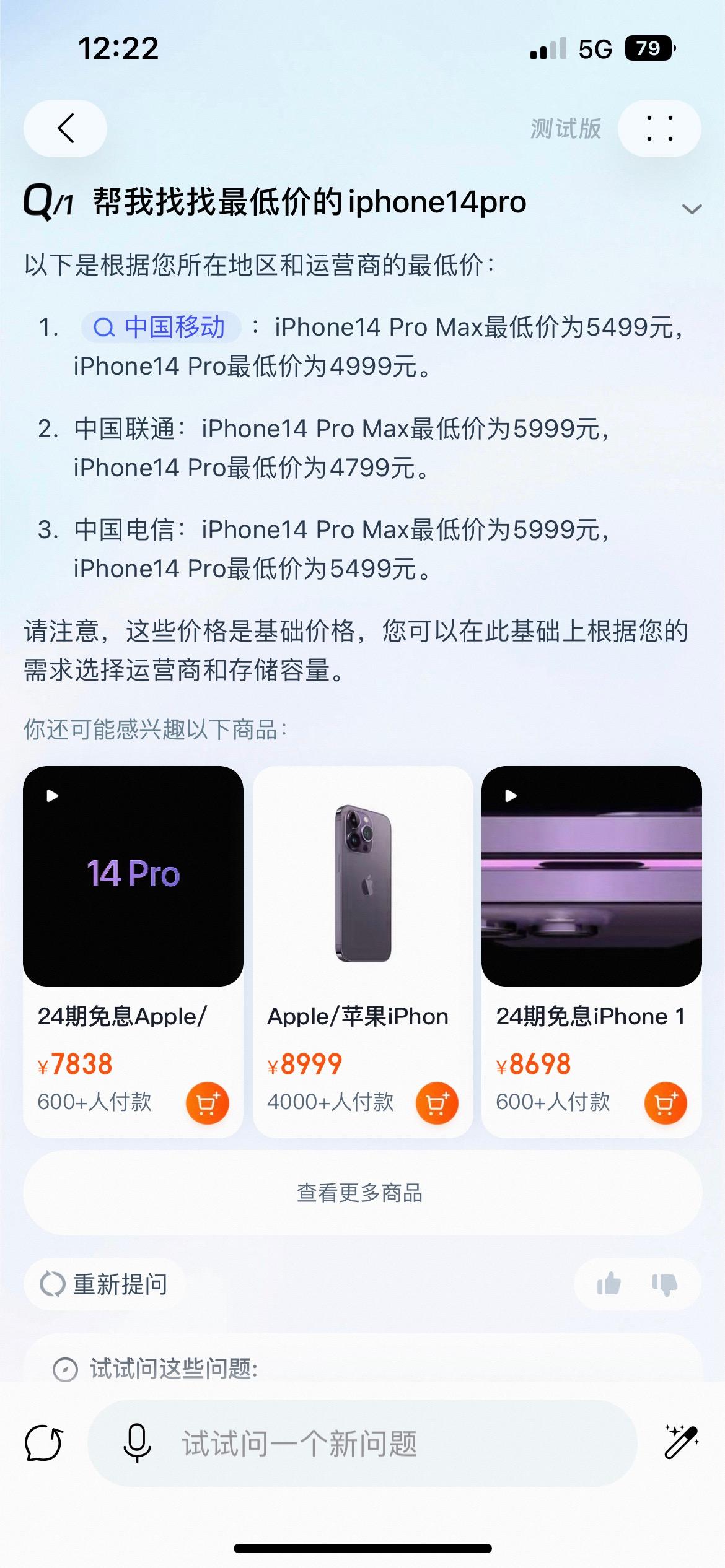 只是,具体到商品挑选环节,站内最低价商品检索、多款产品比价等功能,在测试版本中暂时还无法实现。值得关注的是,淘宝问问的导购推荐似乎并不局限于淘内,比如询问“在哪里买iphone更优惠”,回答会客观推荐多个电商平台,供提问者参考。