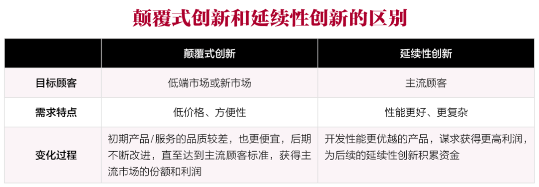 颠覆式创新就是这样一种不容易被理解的创新类型(因为它常常是粗糙的、不起眼的),与常规的延续性创新(追求性能越来越好)的思维方式相反,也因此为其留下了保护与发展的空间。