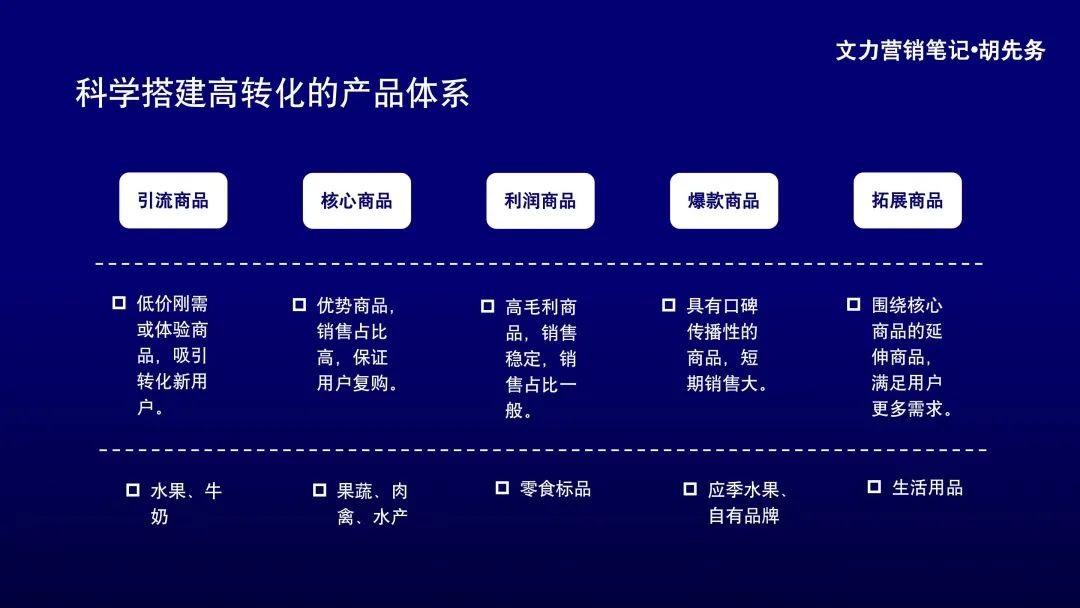 一套完整的产品体系包括引流商品、核心商品、利润商品、爆款商品和拓展商品。这里拿零售行业举例,每类商品概念对应做了补充说明。