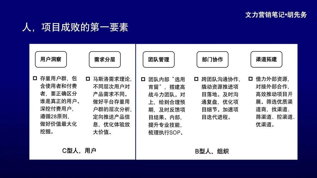 结合自己目前有限的经验,从5个视角对“人”做了梳理。分别是用户洞察、需求分层、团队管理、部门协作、渠道拓建。用户洞察、需求分层偏向用户本身。团队管理、部门协作、渠道拓建偏向组织层面。