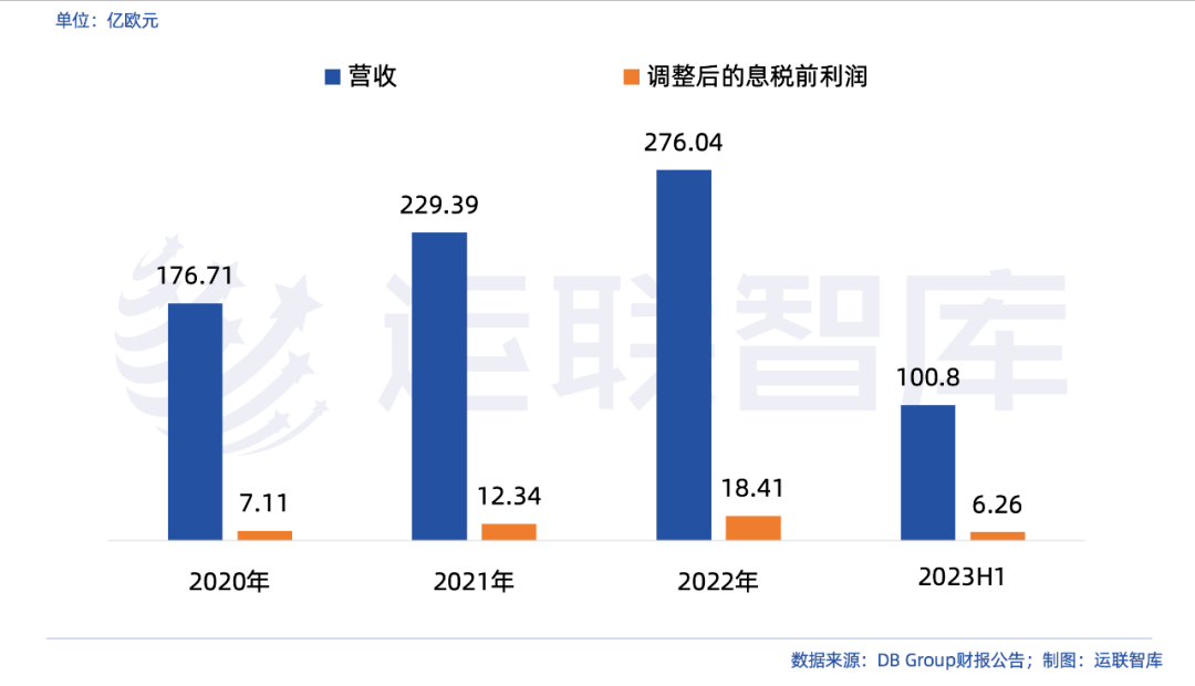 根据德铁集团公布的2023上半年业绩,其实现约250亿欧元的营业收入,调整后的息税前利润(EBIT adjusted)达到3.31亿欧元,其中,DB Schenker实现收入约100.8亿欧元,调整后的EBIT约为6.26亿欧元。