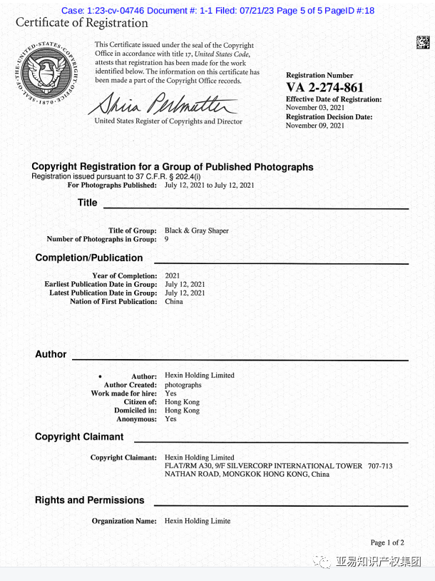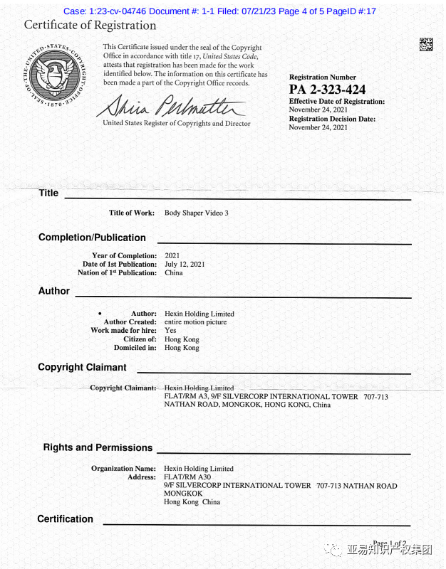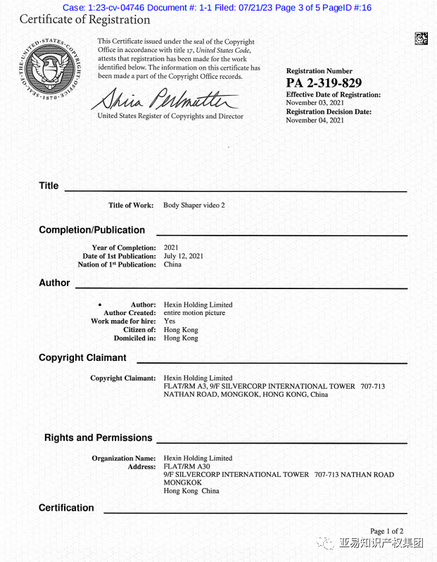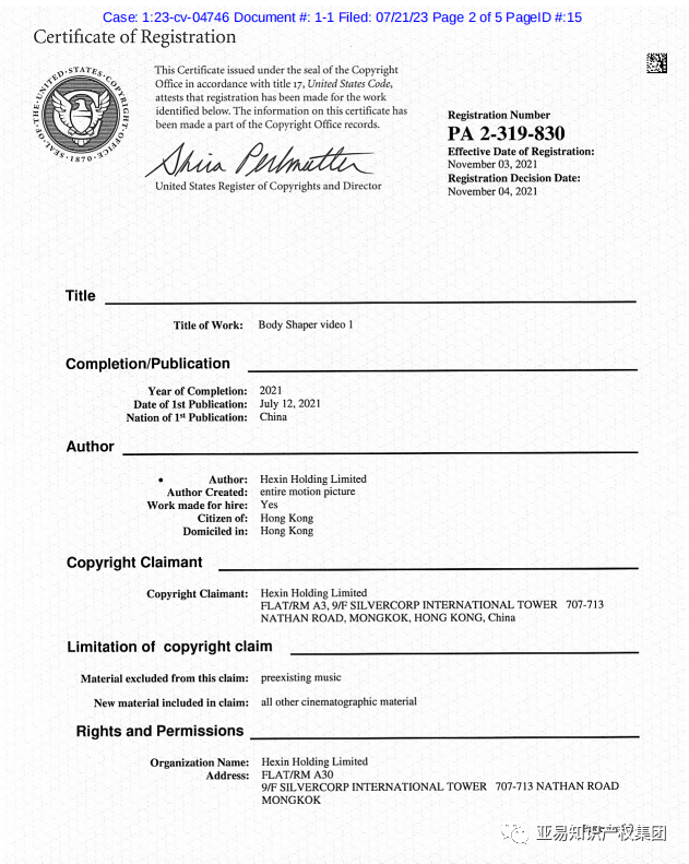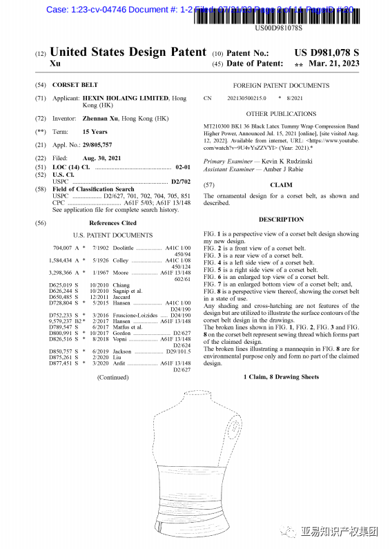 Corset belt 束腹带品牌权利人为Hexin Holding Limited,最新案件在23年7月21号发起,案件编号23-cv-4746。