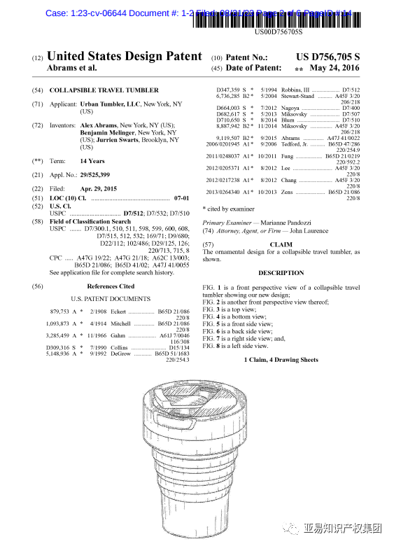 该专利申请于2015年提交,并于2016年5月24日获得批准,专利覆盖了整个杯子的外观设计。