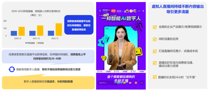随着消费者注意力资源进一步分散,消费者在单一内容上停留时长不断缩短,已缩减至约30-40秒左右。数字人直播能够实现长时间、不间断内容输出,帮助商家吸引流量。而且数字人直播不受直播间场域限制,不受主播语言、能力与精力限制,能够适用于海内外不同平台、不同地域、不同品类的直播,能帮助品牌和产品更广泛的传播。
