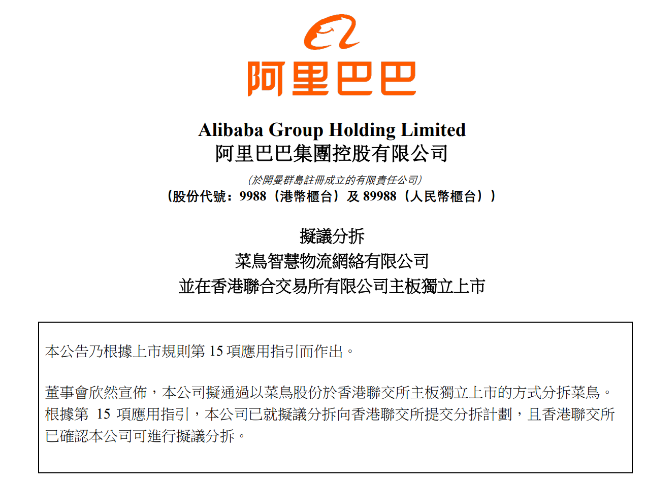 公告称,董事会认为拟议分拆将对公司及菜鸟有利,其中包括:
