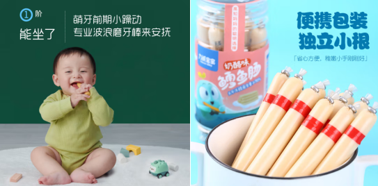 从不同年龄结算看,饼干/磨牙棒、溶豆/小馒头和米饼泡芙,更受7-24个月孩子家庭欢迎;1岁以上对奶片奶酪、鱼肠肉肠、海苔和糖果/果条需求增多。