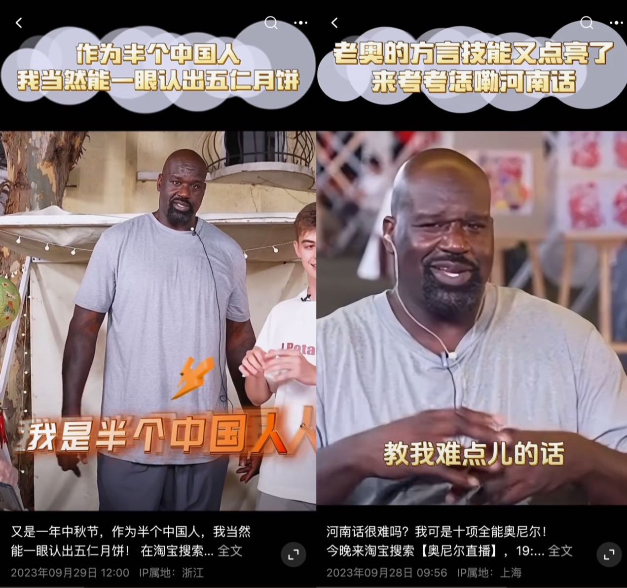 篮球巨星奥尼尔淘宝直播第二场,正值中国传统佳节中秋节,奥尼尔在主持人的带领下一同逛起了中秋集会。在集会现场与十二位多才多艺的淘宝内容主播们一起打麻将、跳广场舞、制作中国美食、体验千年垂钓等中华文化特色活动。自称“半个中国人”的奥尼尔在猜月饼馅的游戏环节,也是一眼便在众多月饼中认出五仁馅,同时还用中文为观众们送去了中秋祝福。