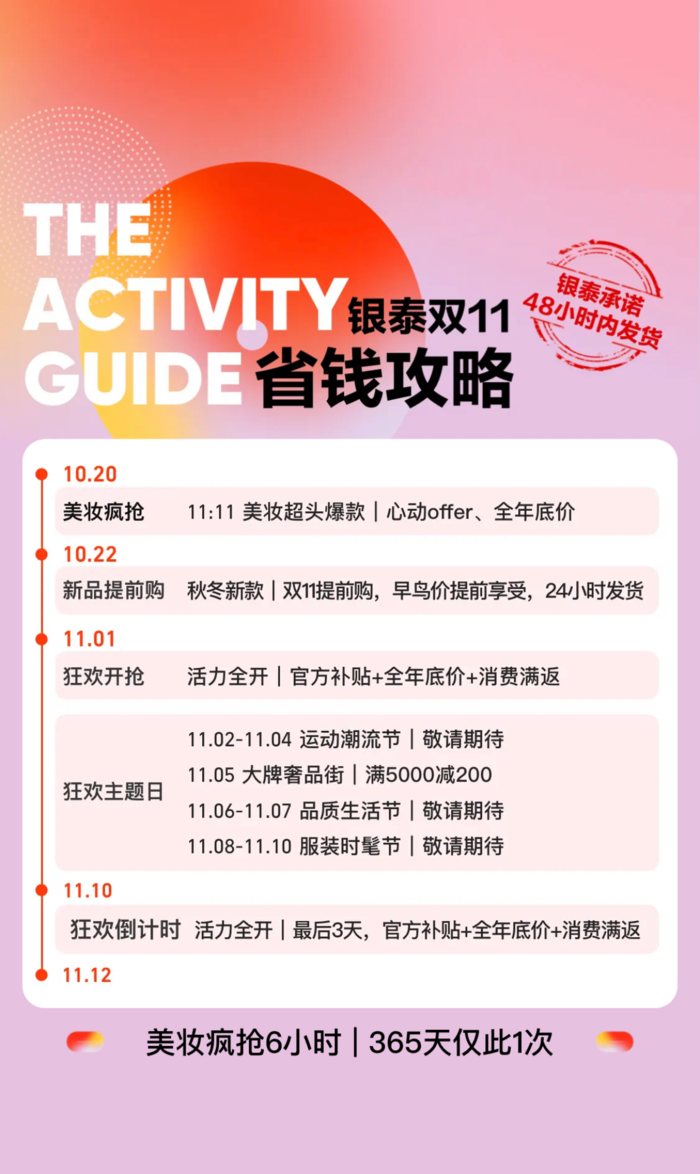 据介绍,今年双11银泰百货主打线上线下好价先享,线上极速发货,线下好货预购。包括上述直播间订单在内的全量喵街非预售订单,银泰百货承诺48小时内全量发货,逾期将进行线上赔付。