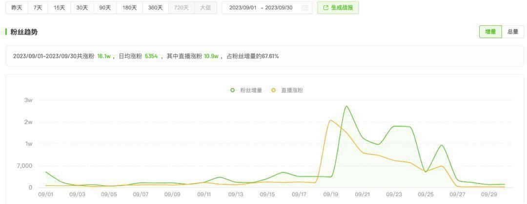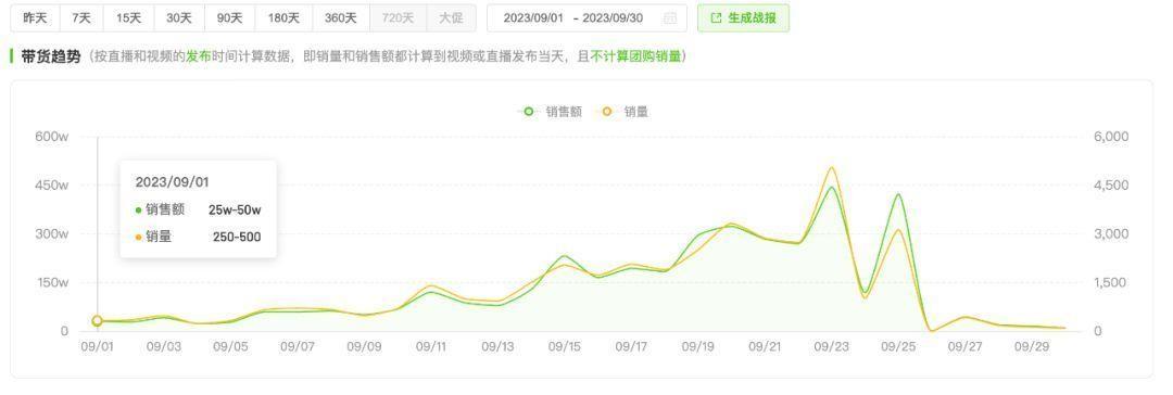 数据表现侧:飞瓜数据显示,超品日开启后,洋河股份通过直播涨粉迅速,整个超品日期间通过直播涨粉了8万左右。9月23日当天品牌官方直播带货销售额为250万至500万,是整个9月最高。