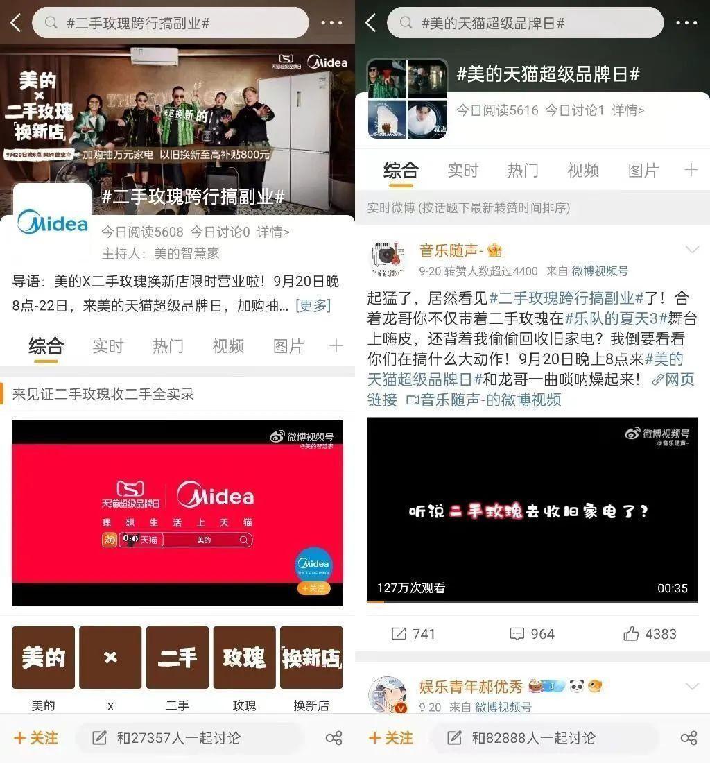 数据表现方面:截止到10月12日,品牌微博话题“美的天猫超级品牌日”阅读量已经超过1.4亿,互动量超过29万。其中,9月21日阅读量超过3443万,数据表现为近30天最佳。另一主要传播话题“二手玫瑰跨行搞副业”阅读量超过4亿,互动量超过21万,9月20日当天话题阅读量超过1.8亿,互动量超过11万。