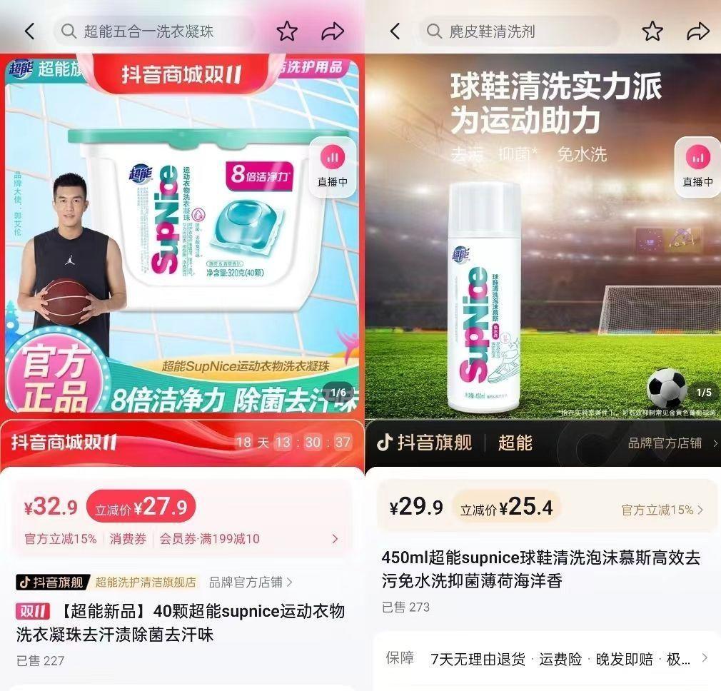 产品侧:超能SupNice运动系列衣物洗衣液、洗衣凝珠、运动精油香氛洗发露、沐浴露、小白鞋清洁美白套装等个人洗护用品均参与本次抖音超品日活动。