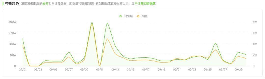 数据表现侧:清风在站内的主要传播话题“用金装夺金牌”播放量超过2069万次,品牌9月8日发布的活动挑战宣传预热视频喜欢量超过4450次,为品牌日常内容喜欢量千倍左右。根据飞瓜数据,9月10日和9月12日当天的直播销售额达到250万-500万,为整个9月销售最高。